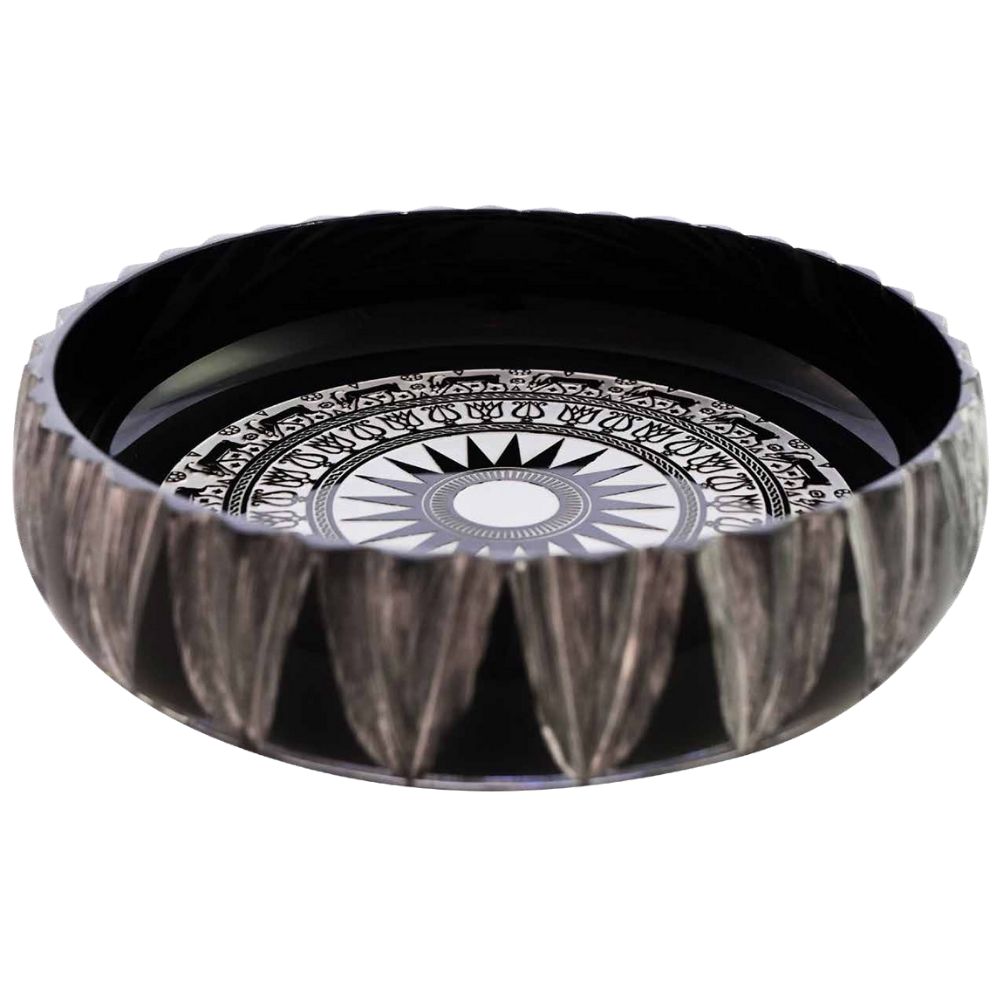 Bu kase, Anadolu’nun merkezî bölgelerinde görülen anıtsal taş ve seramik işçiliğinin ritmik desen anlayışını cam formla buluşturan özgün bir tasarımdır. Geniş yüzeyinde yer alan göz alıcı motifler, iç kısımda konumlanan rozet formuyla birleşerek hem geleneksel hem çağdaş bir estetik dengesi oluşturur. Tamamen el işçiliği ile üretilen bu parça, koleksiyonluk bir sanat objesi olarak vitrinlerde ve özel mekân kurgularında güçlü bir odak noktası yaratır.