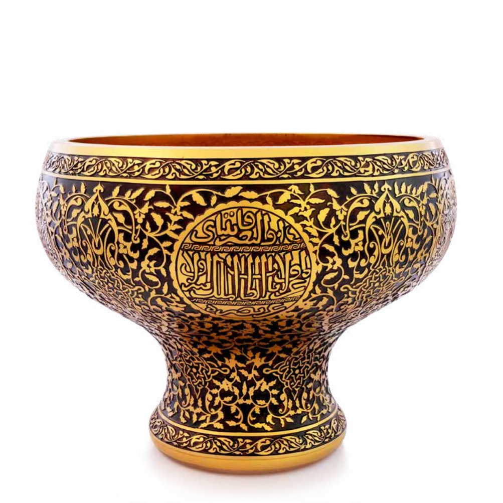 Bade Serisi Ayaklı Kase, Topkapı Sarayı’nda yer alan yayvan kaselerin oranlarını koruyarak, yükseltilmiş bir ayak formu ile yeniden tasarlanmıştır. Gövdeyi saran yoğun bitkisel süslemeler ve merkezdeki hat kartuşu, 13. yüzyıl metal işçiliğinin zarif detaylarını cam yüzeyde yaşatır.