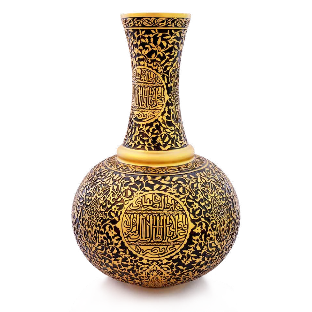Gövdeyi saran lotus çiçeği ve yaprak kompozisyonları, 13. yüzyıl metal işçiliğinin nadir örneklerini referans alır. 24 ayar ve organik altınla işlenen desenler, ışıkla birlikte hareket eden sıcak bir parıltı yaratır. Tek başına sergilendiğinde dahi cam bir heykel etkisi sunar; taze veya kuru çiçek aranjmanlarında ise salonun odak noktası hâline gelir.