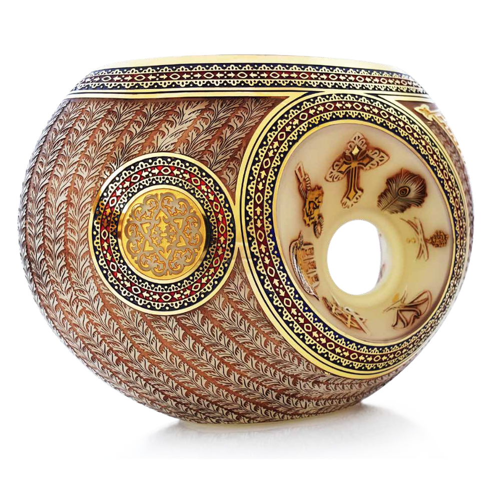Ayasofya’nın kubbeli bazilika mimarisinden ve iç mekândaki altın mozaiklerinden esinlenerek tasarlanan “Kutsal 7” vazosu, üzerinde yedi dini sembol barındıran, 24 ayar altın ve organik boyalarla tamamen el işçiliğiyle işlenmiş özel bir koleksiyon parçasıdır.