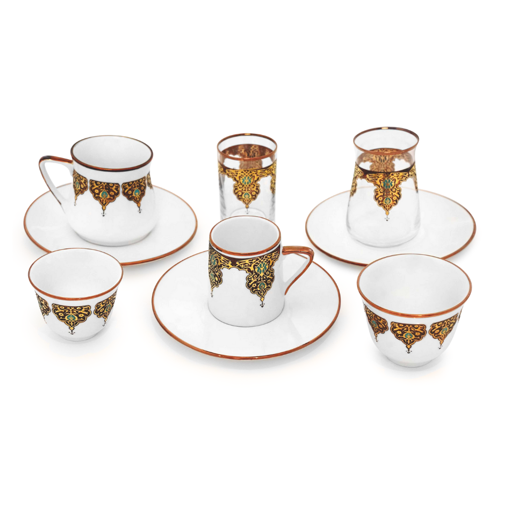 • Kahve, çay ve mirra sunumları için farklı parçalardan oluşan bütünlüklü bardak grubu